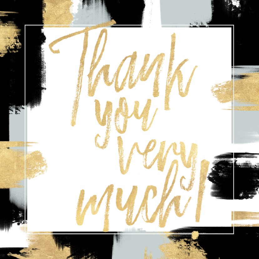 Eine hippe Dankeskarte im Goldlook mit Foto und Farbsteifen in gold, grau und schwarz. (Für quadratische Karten fallen extra Portokosten an.)