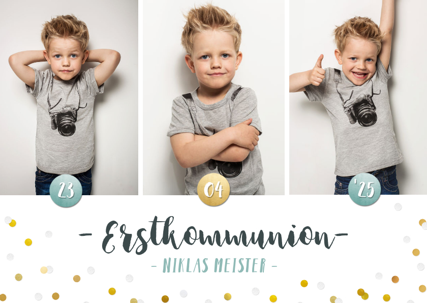 Tolle Einladung zur Kommunion mit Fotocollage, blauen Akzenten und lustigen Konfetti. Einfach eigene Fotos und Texte einfügen!