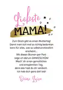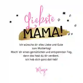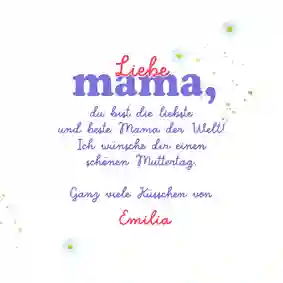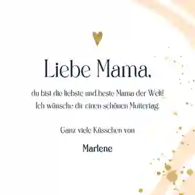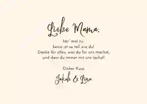 Persönliche Worte, die von Herzen kommen, kommen immer gut an. Sage deiner Mama, wie sehr du sie liebst, bedanke dich für alles, was sie für dich tut, und dass sie immer für dich da ist. Beschreibe in deinen eigenen Worten, was du an deiner Mutter am meisten wertschätzt. Du brauchst Inspiration? Dann stöbere einfach in unseren Beispieltexten:
