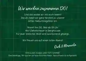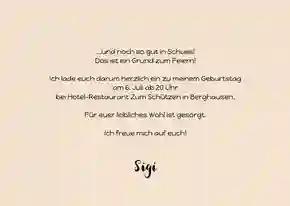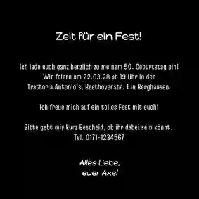 Je nach kreativer Laune kannst du auf deinen Einladungskarten noch einen passenden Songtext, einen Spruch oder ein Gedicht hinzufügen. Für den ein oder anderen Gedankenanstoß eignen sich auch unsere Vorlagen für Einladungstexte zum Geburtstag wunderbar.