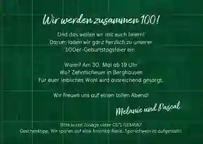 Du möchtest deiner Einladung lieber eine humorvolle Note verpassen? Dann eignen sich kreative Sprüche perfekt. Ein Beispiel: „Ach du Schreck, die 3 ist weg! Ich feiere meinen runden Geburtstag!“ Oder vielleicht: „50 + 50 = 100! Wir laden zum runden Doppelgeburtstag ein!“