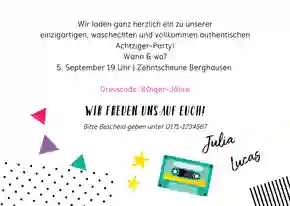 Du hast dich für ein Thema entschieden? Schick dann eine Einladung zur Mottoparty im gleichen Stil der Party, damit deine Gäste wissen, was sie erwartet. Entscheide dich für eine Karte und leg los!