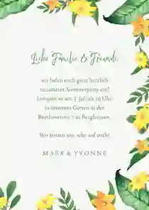 Passend zum Sommer sollte das Design deiner Einladung zum Sommerfest auch farbenfroh und fröhlich sein. Deshalb haben unsere Designer viele blumige und strahlende Vorlagen für dich erstellt, die du noch nach Wunsch personalisieren kannst. Entscheide dich zum Beispiel für eine Karte zur Beachparty mit Wegweisern, eine Einladung mit Blumen für deine Gartenparty oder eine Flamingo-Karte für die Cocktail- oder Hawaii Party.
