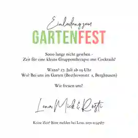 ☀️ Tipp: Lädst du zum Grillen oder zur Gartenparty ein? Dann wirf auch einen Blick auf unsere Einladungskarten für ein Gartenfest.
