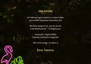 Wähle eine unserer Vorlagen oder gestalte deine Sommerparty Einladung komplett selbst. Auch unsere Vorlagen kannst du natürlich ganz nach deinem Geschmack bearbeiten und anpassen. Vielleicht hast du ein Motto für deine Sommerparty, wie beispielsweise eine Hawaii- oder Cocktailparty. Gestalte deine Sommerparty Einladung dann passend zu diesem Motto. Nicht nur ein Geburtstag ist ein Anlass für eine Sommerparty. Schau dir auch unsere Einladungskarten zu anderen Anlässen an.