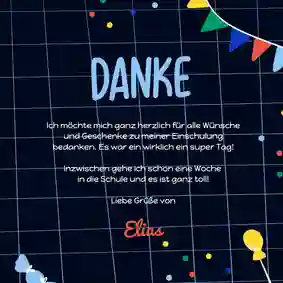 Bunte Menükarte zur Einschulung mit großer Schultüte, Girlande, Stift, Süßigkeiten und Konfetti. Vorlage nach Wunsch gestalten!