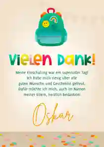 Fröhliche Menükarte zur Einschulungsfeier mit buntem Rucksack und Konfetti. Passe die Kartenvorlage einfach nach deinem Bedarf an!