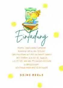 Fröhliche Menükarte zur Einschulungsfeier mit Eule und Schultüte. Gestalten Sie die Vorlage ganz nach Wunsch, evtl. mit Foto auf der Rückseite.