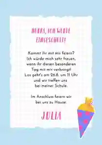 Der erste Schultag ist ein großer Meilenstein – besonders für Mädchen. Mit glänzenden Augen, neuer Schultasche und einer großen Portion Neugier starten sie in ein aufregendes Abenteuer. Eine persönliche Einschulungskarte ist dabei viel mehr als ein netter Gruß: Sie ist ein liebevoller Begleiter in eine neue Lebensphase und dient für viele als bleibende Erinnerung. Bei uns findest du liebevoll gestaltete Einschulungskarten für Mädchen, die du ganz einfach mit eigenem Text, Namen und sogar Foto personalisieren kannst.