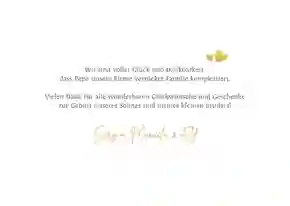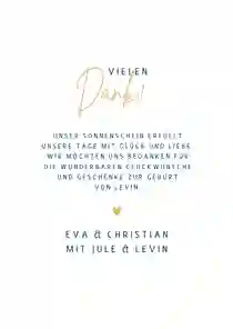 “Unser Sonnenschein NAME erfüllt unsere Tage mit Glück und Liebe. Wir möchten uns bedanken für die wunderbaren Glückwünsche und Geschenke zur Geburt unseres Sohnes.”