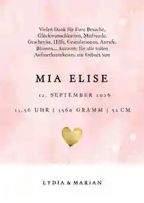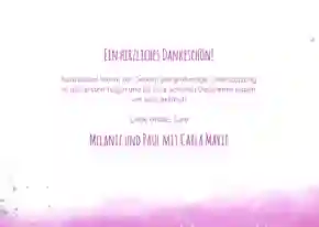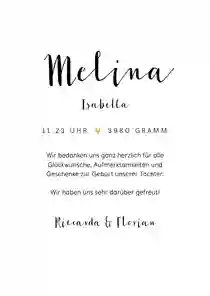 Euer kleines Wunder ist bereits einige Wochen auf der Welt und ihr möchtet euch bei euren Liebsten für alle Glückwünsche, Geschenke und Aufmerksamkeiten zur Geburt bedanken? Mit individuellen Dankeskarten zur Geburt eines Mädchens überbringt ihr eure Gefühle. Personalisiert eure Dankeskarten ganz einfach online mit: