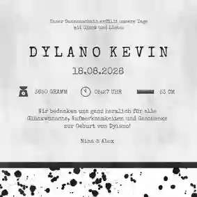 Neben dem Namen, einem Foto und den Geburtsdaten eures Sohnes ist noch Platz für ein schönes Zitat zur Geburt? Dann wählt gerne einen dieser Sprüche oder lasst euch in unserem Blogartikel von noch mehr Zitaten für Jungen inspirieren.