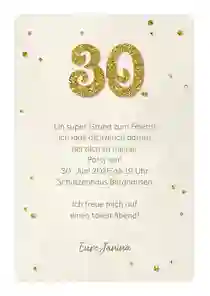 Dank unserer großen Auswahl an Design-Vorlagen findest du garantiert einen Look, der zu deiner Feier passt. Lass die „30“ beispielsweise durch Goldfolien-Veredelung erstrahlen oder entscheide dich für eine verspielte Retro-Optik – ganz, wie es deinem Stil entspricht!