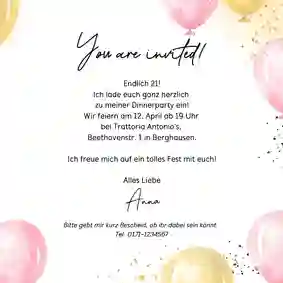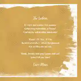 🙋♀️ Schreib dein Alter auf die Vorderseite der Karte. Gerade bei runden Geburtstagen ist es üblich, das Alter in großen Ziffern hinzuzufügen. Ob 40. Geburtstag, 50, 60 oder 70 Jahre – dein Alter verdient einen Ehrenplatz auf deinen Einladungskarten.