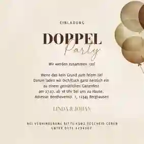 Ob du eine Einladung zum Doppelgeburtstag für ein Ehepaar, für Mutter und Kind, für Freunde oder für die ganze Familie erstellst – bei uns gestaltest du im Handumdrehen ganz persönliche Geburtstagseinladungen. Wähle eine Doppelgeburtstag Einladung mit (Zahlen)Luftballons, Konfetti, einem lustigen Spruch wie z. B. “So jung kommen wir nicht mehr zusammen” oder mit eigenen Fotos von euch beiden oder der ganzen Familie. Sogar eine persönliche Videobotschaft ist möglich. So machst du deine Doppelgeburtstag Einladungskarten wirklich originell und einzigartig!