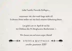 Es ist schon etwas ganz Besonderes, wenn sich eure Geburtstage im selben Jahr zu einer runden Zahl zusammenfügen und du zu eurem Doppelgeburtstag einladen kannst. Werdet du und dein Partner dieses Jahr beide 40, 50 oder 60 Jahre? Dann feiert doch zusammen und ladet mit einer Einladung zum gemeinsamen Geburtstag ein. Aber nicht nur Partner, sondern auch Freunde, Familienmitglieder oder Ehepaare können den Geburtstag zusammen feiern. Eine Geburtstagsparty unter dem Motto “Wir werden 100!” oder “Zusammen 120 Jahre!” ist eine tolle Gelegenheit, mit all euren Liebsten zu einer großen Geburtstagsfeier zusammenzukommen.