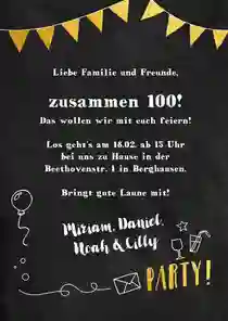 - Texte wie ‘Doppelparty’, ‘Wir werden zusammen 120’, ‘Einladung zum Doppelgeburtstag’ oder ‘Zusammen 100’ sind deutlich und sprechen für sich. Hier findest du noch mehr Einladungstexte zum Doppelgeburtstag.