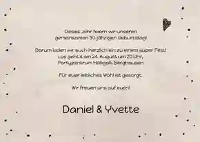 Es ist schon etwas ganz Besonderes, wenn sich eure Geburtstage im selben Jahr zu einer runden Zahl zusammenfügen und du zu eurem Doppelgeburtstag einladen kannst. Werdet du und dein Partner dieses Jahr beide 40, 50 oder 60 Jahre? Dann feiert doch zusammen und ladet mit einer Einladung zum gemeinsamen Geburtstag ein. Aber nicht nur Partner, sondern auch Freunde, Familienmitglieder oder Ehepaare können den Geburtstag zusammen feiern. Eine Geburtstagsparty unter dem Motto “Wir werden 100!” oder “Zusammen 120 Jahre!” ist eine tolle Gelegenheit, mit all euren Liebsten zu einer großen Geburtstagsfeier zusammenzukommen.