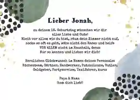 Ein lustiger Spruch über das Erwachsensein, Wünsche für die Zukunft oder ein kleiner Rückblick auf die schönsten Momente in den letzten 18 Jahren – all das kannst du in deiner Geburtstagskarte zum 18. Geburtstag unterbringen. Formuliere deine Worte persönlich – und eventuell mit einer kleinen Prise Humor!