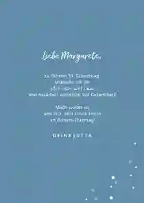 Die 80 im Mittelpunkt deiner Geburtstagskarte – ein Hingucker mit ganz besonderer Bedeutung. Bei diesem runden Geburtstag dreht sich alles ums Alter. Setz die 80 deshalb besonders in Szene und platziere sie mittig auf deiner Geburtstagskarte. Um sie extra hervorzuheben, veredel die Zahl mit eleganter Gold- oder Silberfolie. Deine Glückwunschkarte zum 80. Geburtstag verwandelt sich in ganz besondere Geburtstagspost und strahlt mit dem Jubilar um die Wette.