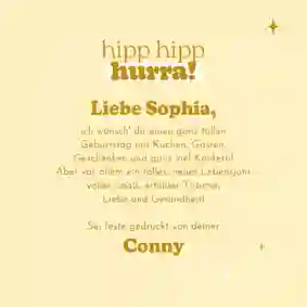 Zuerst wählst du deinen liebsten Entwurf. Und überlegst dir, ob du mit einer kleinen oder einer riesigen Botschaft überraschen möchtest. Danach passt du die Farben, Formen und Schriften deiner Glückwünsche an. Lustige Sticker, Rahmen oder ein Foto von der Beglückwünschten verzaubern alle Geburtstagskarten für Frauen. Fragst du dich jetzt, wie das alles funktioniert? Kinderleicht! Denn unser Designtool leitet dich Schritt für Schritt durch den Prozess. Und verwandelt gemeinsam mit dir deine Wünsche in ein echtes Meisterwerk. Dabei spielt es keine Rolle, ob du eine lustige Geburtstagskarte für eine Frau gestaltest oder lieber schöne Geburtstagskarten für Frauen entwirfst – im Nu ist das Design fertig.