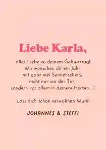 Bei schönen Geburtstagskarten für Frauen hingegen ist ein tiefgehender Text passender. Formuliere deine Wünsche persönlich – vielleicht fällt dir eine gemeinsame Geschichte ein? Oder wünschst du deinem Herzensmenschen, dass sie das Bevorstehende leicht schafft.
