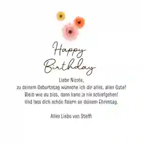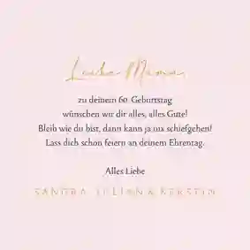 "Liebste Mama, danke, dass du immer für mich da bist und mir im vergangenen Jahr so oft unter die Arme gegriffen hast. Ohne dich hätte ich das alles nicht geschafft. Aber heute sollst du im Mittelpunkt stehen. Ich wünsche dir alles Gute und einen unvergesslich schönen Tag!"