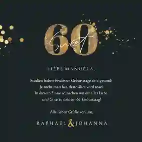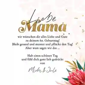 "Hipp, hipp, hurra! Die allerbeste Mama und Oma ist nun 60 Jahr’! Möge dein neues Lebensjahr mit viel Liebe, Freude und Gesundheit gefüllt sein. Liebste Mama, wir wünschen dir einen wundervollen Geburtstag mit all’ deinen Liebsten um dich herum."