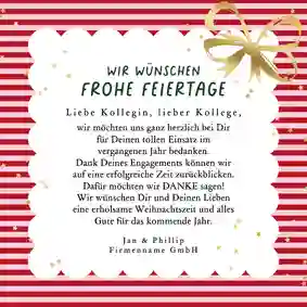 Eine Weihnachtskarte für Mitarbeiter ist die perfekte Gelegenheit, Danke zu sagen – für Engagement, Teamgeist und den Einsatz im vergangenen Jahr. Solche Weihnachtsgrüße zeigen echte Wertschätzung und stärken das Miteinander im Unternehmen. Wünsche deinen Mitarbeiterinnen und Mitarbeitern erholsame Feiertage, schöne Weihnachten und einen guten Start ins neue Jahr.