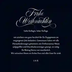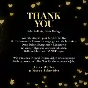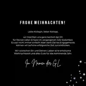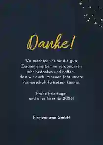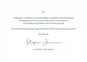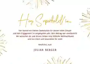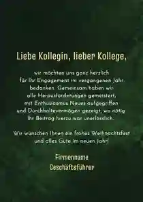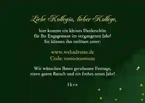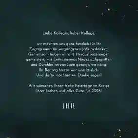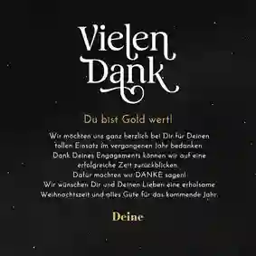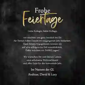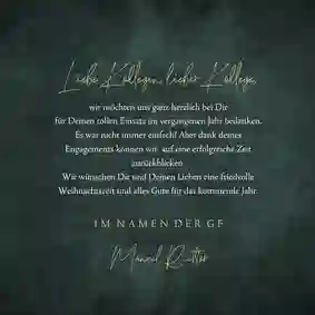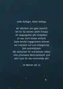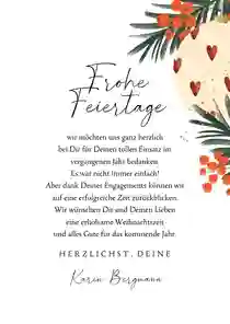 Eine Weihnachtskarte für Mitarbeiter ist die perfekte Gelegenheit, Danke zu sagen – für Engagement, Teamgeist und den Einsatz im vergangenen Jahr. Solche Weihnachtsgrüße zeigen echte Wertschätzung und stärken das Miteinander im Unternehmen. Wünsche deinen Mitarbeiterinnen und Mitarbeitern erholsame Feiertage, schöne Weihnachten und einen guten Start ins neue Jahr.