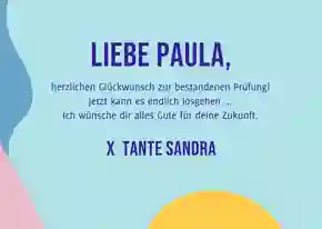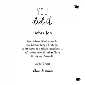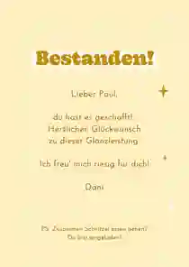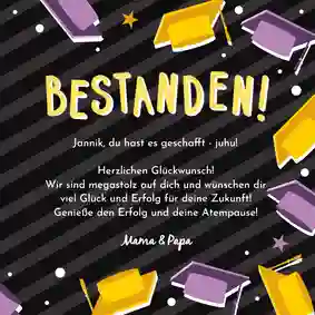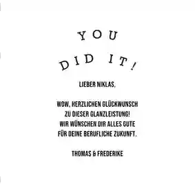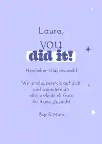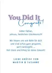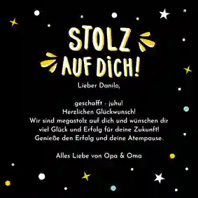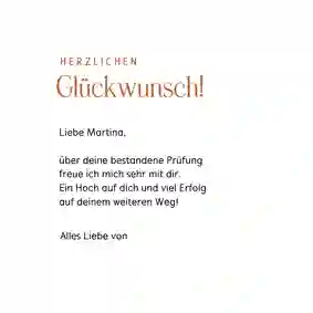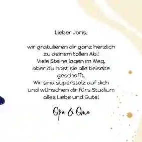 “Yeah, in the pocket! Herzlichen Glückwunsch zum bestandenen Abitur! Ein großer Meilenstein, auf den du besonders stolz sein kannst. Ich wünsche dir für deine Zukunft alles erdenklich Gute!” – So könnte der Text in deiner Karte zum Abitur aussehen. Aber auch persönliche Gedanken, Gefühle und Geschichten kommen auf der Glückwunschkarte gut an.