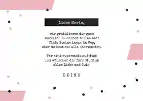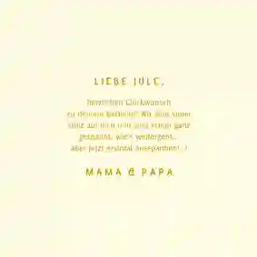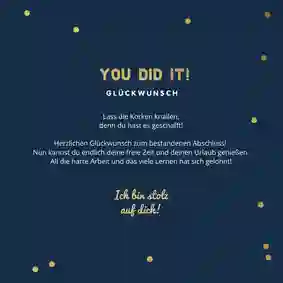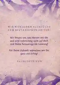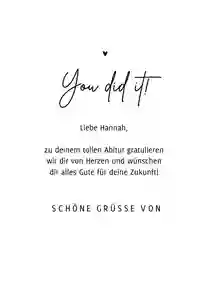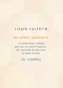 “Yeah, in the pocket! Herzlichen Glückwunsch zum bestandenen Abitur! Ein großer Meilenstein, auf den du besonders stolz sein kannst. Ich wünsche dir für deine Zukunft alles erdenklich Gute!” – So könnte der Text in deiner Karte zum Abitur aussehen. Aber auch persönliche Gedanken, Gefühle und Geschichten kommen auf der Glückwunschkarte gut an.