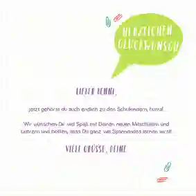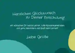 Wenn du die Grußkarte lieber persönlich überreichen möchtest, bestellst du die Glückwunschkarte zur Einschulung erst zu dir nach Hause. Wir liefern sie mit einem (farbigen) Umschlag und du kannst sie am Tag der Einschulung verschenken.
