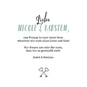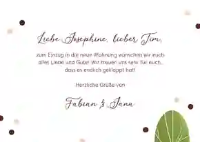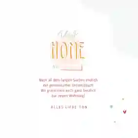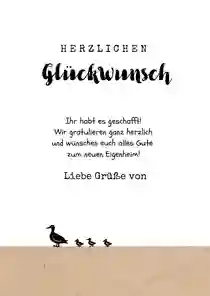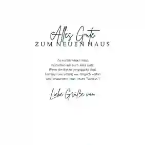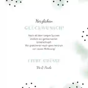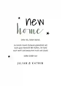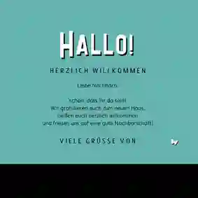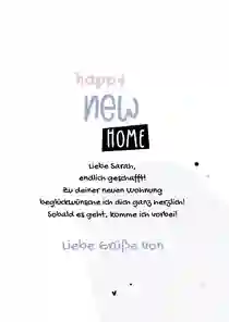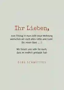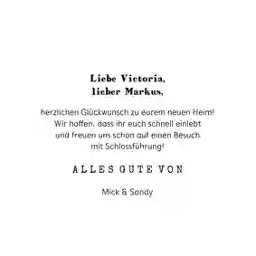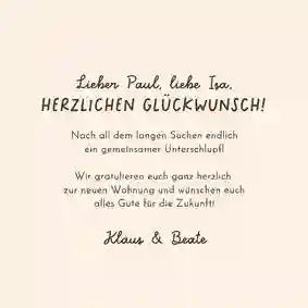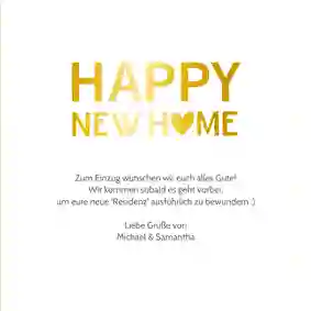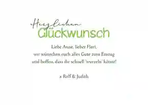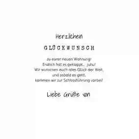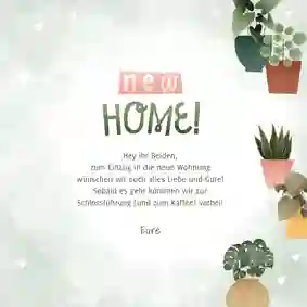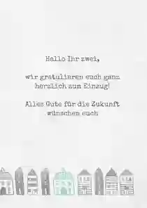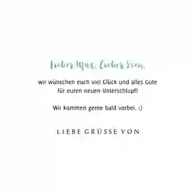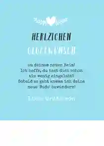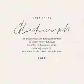 Egal, ob es sich um eine neue Wohnung, ein Haus, ein Studentenzimmer oder einen Bauernhof handelt – eine Glückwunschkarte kommt immer gut an und kann jeweils auf den Empfänger oder die Empfängerin angepasst werden.