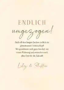 Bist du selbst gerade umgezogen und willst Freund:innen und Familie deine neue Adresse mitteilen oder zur Housewarming-Party einladen? Dann schau dir auch unsere Umzugskarten oder Einladungen zur Einweihung an. So teilst du deinen Lieben auf originelle Art und Weise deine neue Adresse mit und lädst in deine neue Wohnung oder dein neues Haus ein.