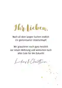 Tipp: Suchst du noch nach den passenden Worten für deine Glückwunschkarte zum Einzug? In unserem Artikel "So schreibst du originelle Glückwünsche zum Einzug" findest du tolle Textvorlagen.