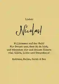 Neben den Glückwünschen oder dem Willkommensspruch sollte der Name des Babys im Vordergrund stehen. Hebe ihn mit einer besonderen Farbe oder Schriftart hervor.