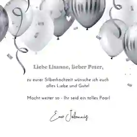 In guten wie in schlechten Zeiten – und das in 25 Jahren. Ob du bei der Hochzeit dabei warst, ist egal, denn dein Jubelpaar freut sich so oder so über Karten zur Silberhochzeit. Als Motive passen eine 25 oder die Farbe Silber. Ein silberner Briefumschlag umhüllt deine Wünsche zum 25-jährigen Jubiläum mit einem Glanz, den sich das Jubelpaar verdient hat.