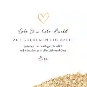 Schreib in deine Karten für die Goldene Hochzeit, was du dem Jubelpaar wünschst. Erzähl eure Geschichte oder lass große Persönlichkeiten in deinen Glückwunschkarten für die Goldene Hochzeit sprechen. Sprüche, Zitate und Gedichte findest du im Artikel „Die schönsten Glückwünsche zur Goldenen Hochzeit“.