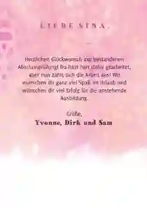 Füge außerdem einen lustigen Glückwunschtext hinzu. Du kannst der Person natürlich auch zunächst zum Anlass gratulieren und zusätzlich dazu einen weiteren Text, Spruch oder ein lustiges Gedicht einfügen.