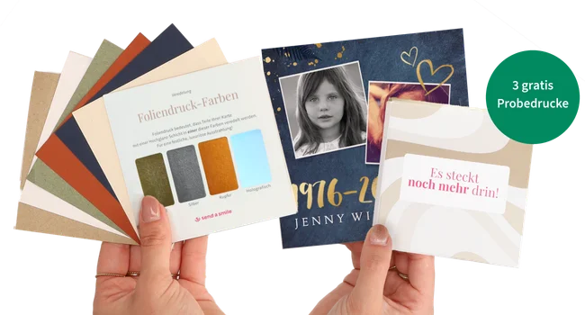 Hast du bereits eine Karte gestaltet? Logge dich ein, gehe zu deinem Entwurf oder Warenkorb und wähle bei der Versandart „Probedruck bestellen“ aus. Dein Entwurf bleibt vollständig erhalten – du musst nichts neu gestalten.