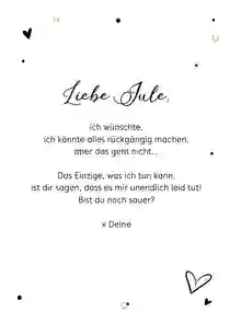 Es gibt viele Momente in unserem Leben, für die wir uns entschuldigen möchten. Egal, ob es sich nun um einen Freund oder eine Freundin handelt, die Schwester oder einen Kollegen. Je nachdem, wofür du dich entschuldigst, kann so eine Entschuldigung manchmal viel Überwindung und Mut kosten. Möchtest du dich nicht direkt entschuldigen oder wurde deine persönliche Entschuldigung nicht wahrgenommen? Gestalte und verschicke dann eine liebevolle Entschuldigungskarte, um dem Empfänger oder der Empfängerin zu zeigen, dass es dir wirklich leid tut.