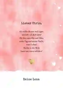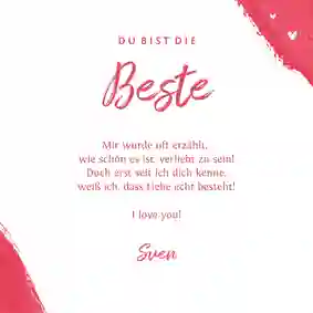 Wähl eine unserer Liebeskarten aus unseren Vorlagen und gestalte sie nach deinen Wünschen. Füge eventuell eigene Fotos hinzu und pass die Texte an. Eine kurze Liebeserklärung, ein paar nette Worte, ein Kompliment oder einfach nur der Satz ‚Ich liebe dich!‘. Mach es so persönlich, wie du möchtest. Du kannst sogar eine eigene kleine Videobotschaft hinzufügen. Übrigens muss es sich nicht direkt um eine Valentinskarte handeln, denn mit einer Liebeskarte kannst du dem Empfänger oder der Empfängerin das ganze Jahr über eine Freude bereiten.