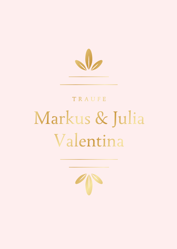 Klassische Einladung zur Traufe mit Schrift und Ornamenten in Golddruck (wahlweise). Die rosé Hintergrundfarbe kann in jede andere geändert werden!