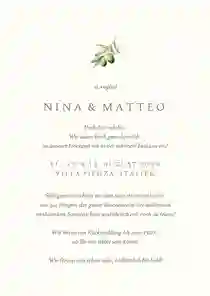 Schlichte Einladungskarte zur Hochzeit mit Olivenzweig als Bogenkarte. Alle wichtigen Informationen selbst anpassen und schnell versenden!