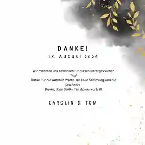 Eine originelle Einladungskarte zur Hochzeit mit einem persönlichen Foto. Gestaltet mit schwarzer Wasserfarbe und eleganten goldenen Zweigen.