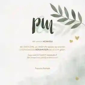 Eine Einladungskarte mit persönlichem Foto im Aquarelldesign. Verziert mit grünen Zweigen und goldenen Herzen.