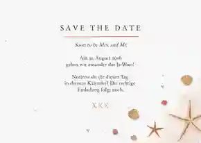 Tolle Hochzeitseinladung im Strandlook mit Foto, Seesternen & Muscheln. (Für quadratische Karten fallen extra Portokosten an.)