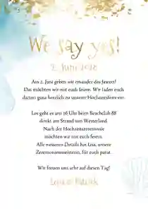 Save-the-Date-Karte in Beachlook mit Elementen in Golddruck (wahlweise). Kartenvorlage und Texte nach Wunsch personalisieren!