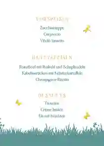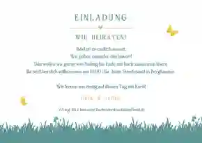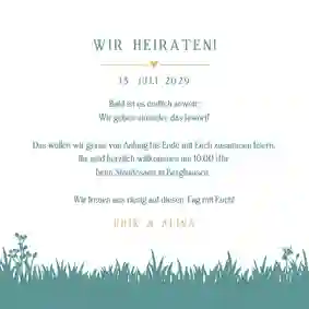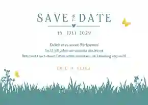 Save-the-Date-Karte zur Hochzeit mit Paar auf Fahrrad in Sommerwiese in moderner Wellenform. Kartenvorlage nach Wunsch anpassen.